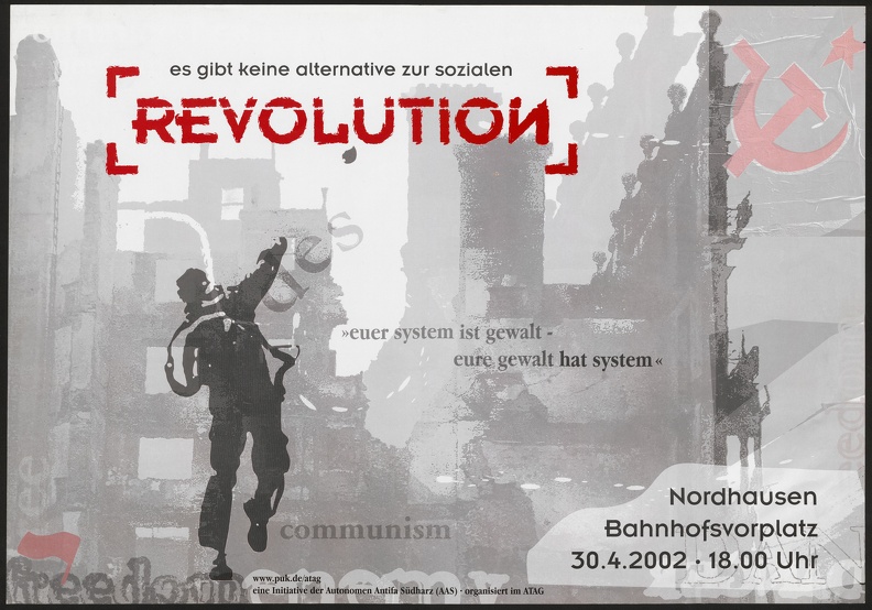 Im obenen Bilddrittel sehen wir das Foto der vermummten Spitze einer Antifa-Demo in Fehlfarben (schwarz-weiß, nur der Schriftzug des Fronttransparents, "Faschisten bekämpfen", ist in rot gehalten). Darunter zwei rufende Frauen mit gereckter Faust, vermutlich historische Antifaschistinnen. Darunter linksbündig und kleiner Fotos von erfolgreichen Antifa-Aktionen der 1990er-Jahre, darunter das Antifa-Logo. Im rechten unteren Bildteil die Werbung für mehrere Kundgebung der Autonomen Thüringer Antifagruppen (ATAG) in Erfurt, Eisenach und Nordhausen. Mobilisiert wurde ausgehend von diesen Kundgebungen zu einer Gegendemo zu einem Naziaufmarsch des Nationalem und Sozialem Aktionsbündnis Westthüringen in Gotha.