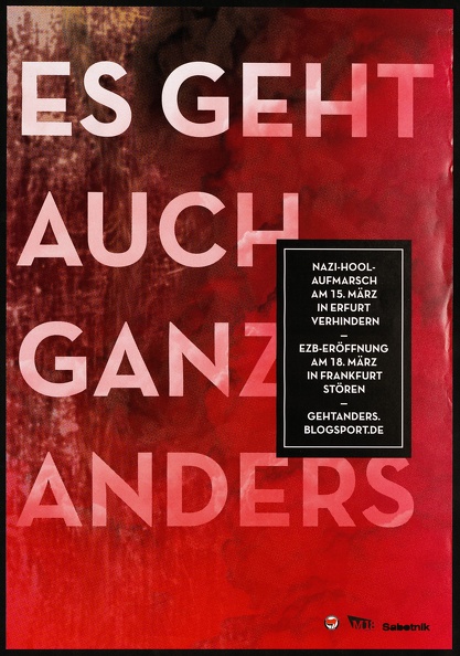 Das linksradikale Bündnis "Grenzen abschaffen" wurde 2016 als Reaktion auf die regelmäßigen AfD-Aufmärsche in Erfurt gegründet. Um dafür neue Mitstreiter*innen zu gewinnen wurde einige Male ein Offenes Antifacafé im veto organisiert. Auf dem Plakat sehen wir einen hellen Hintergrund, wahrscheinlich eine digital bearbeitete Fotografie einer Kopfsteinpflasterstrasse. Mittig sind ist das rot-schwarze Flaggensymbol angeordnet. Es ist das einzige farbige Element. Am unteren Bildrand wird das Anliegen des Plakats erklärt.