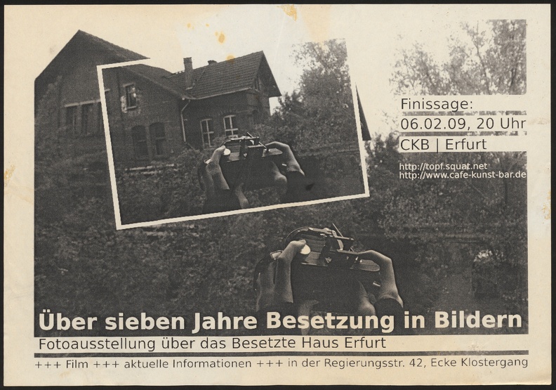 Das zentrale Bildelement des wenig geklebten Plakats zeigt die anthropomorphe Figur eines Bibers (was durch den Schriftzug "Autogrammstunde mit dem Squatterbiber" deutlich wird), eine Faust gereckt, die erfolglos von Baggern angegriffen wird. Im Arm trägt die Figur schützend das "besetzte Haus", die Titelschrift expliziert die Botschaft: "Besetztes Haus Erfurt verteidigen". Im unteren Drittel bewirbt ein Schriftzug Tag X (der erwarteten Räumung des besetzten ehemaligen Topf & Söhne-Gelände), dahinter ein weißes Feld zum Eintragen von Terminen. Darunter wird eine Demo am 24.1.2009 beworben, die neben zahlreichen anderen Aktionen im Januar 2009 wohl auch mit ca. 1000 Teilnehmer*innen stattgefunden hat, wie auf der Seite des lokalen Infoladens zu lesen ist. Zeitzeug*innen können sich nicht erinnern, ob dieses Plakat oft geklebt wurde. Weißt Du mehr darüber? Melde dich bei uns oder hinterlasse einen Kommentar.