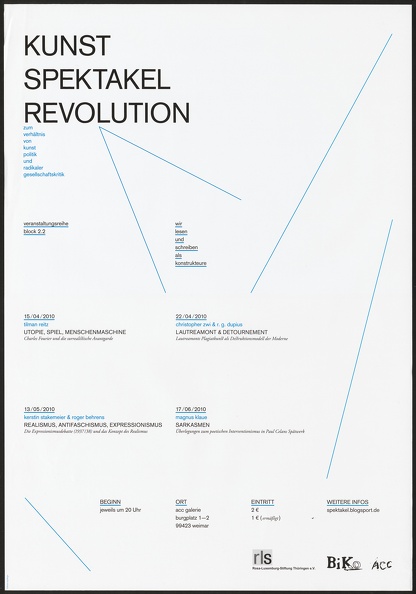 Der Hintergrund des gedruckten Plakats ist komplett durch Schriftsatz realisiert, nämlich durch zahllose aneinander gereihte "x", die aus der Ferne betrachtet ein helles Grau ergeben. Davor sind über die Fläche acht weiße Kästen verteilt, auf denen der Titel der Veranstaltungsreihe (Kunst Spektakel Revolution) und Details zu vier Veranstaltungen gesetzt sind. Zudem gibt es ergänzende dunkelgraue Kästen, die grafisch durch weitere "x" realisiert sind, die leicht versetzt zu denen des Hintergrunds angeordnet sind. In der linken unteren Ecke zeigt ein (den Gesamteindruck eher störendes) aufgeklebtes gelbes Kästchen das Biko-Logo sowie weitere Informationen zu KSR, einer langjährige Veranstaltungsreihe des Biko und der ACC-Gallerie zum Verhältnis von Kunst, Politik und radikaler Gesellschaftskritik.