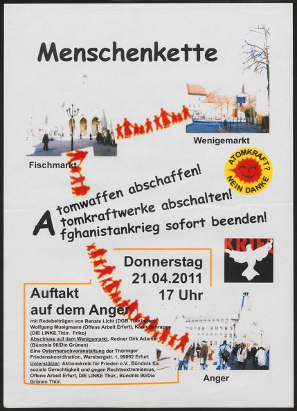 Der Blick des Hingergrundbild richtet sich aus eine Höhle hinaus in den grüngelben, vermutlich verstrahlten Himmel. Davor ein Kind mit einer Gasmaske, dass einen Lampion mit Atom-Zeichen trägt. Im oberen Bildddrittel ist mit verspielter Schriftart das Motto der beworbenen Demo und der entsprechenden Kampagne gedruckt: "Wir strahlen schon", darunter kleiner "Lamion-Demo" und "der Castor kommt". Die typischen Symbole der Anti-Atom-Bewegung (Atommännchen und X) sind hier nicht zu sehen. Dafür wird ein weit verbreitetes und mitunter auch kritisiertes Motiv der Bewegung (Politik mit der Angst vor dem Weltuntergang) ironisch aufgegriffen – denn es ist ja kaum davon auszugehen, dass zukünftige Generationen, die wegen einer verstrahlten Erdoberfläche in Höhlen leben müssen, Lampion-Umzüge unternehmen. Die archivierte Webseite der Kampagne bewirbt die Demo und weißt zusätzlich auf einem Aufruf hin, den Castor, der im Winter 2010/2011 durch Thüringen gefahren ist, zu stoppen. Der Infoladen Sabotnik berichtet davon, dass das im Februar 2011 auch gelungen ist.