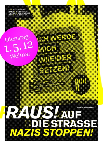 Das gemalte Plakat zeigt vor braunem Hintergrund im oberen drittel "Weimar im April. Gegen Polizeigewalt", darunter ein gemaltes, merkwürdig geformtes, unheimliches Wesen mit grüner Haut, spitzen Zähnen, einer Polizeimütze und einem Knüppel. Es scheint ein weißes Hemd zu tragen. Um unteren Bildviertel ist ein aufgehellter Streifen platziert, auf dem jeweils mit Edding aktuelle Ereignisse, z.B. Verhandlungstage oder der Hinweis auf die hier archivierte Webseite geschrieben wurde. Anlass des Plakats waren die Ereignisse vom 19.4.2012, als vier junge Menschen eine Nacht lang in einer Polizeiwache in Weimar misshandelt worden waren. Weißt Du mehr über den Ausgang der juristischen Aufarbeitung? Kontaktiere uns oder hinterlasse einen Kommentar.