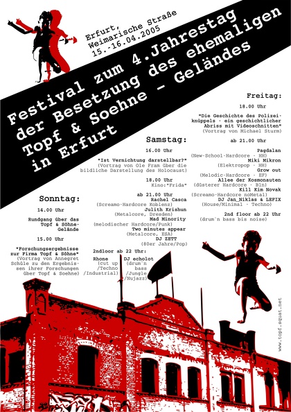 Das Plakat bewirbt das Zwei-Jahre-besetzt-Festival des besetzten Hauses Erfurt. Bei diesem Festival gab es vom 11.-13-4. Konzerte, Kino, Theater, einen Vortrag und eine Kundgebung. Außerdem wurde am 13.04. der Rundgang über das Topf und Söhne Gelände eröffnet. Bei diesem Rundgang wurde auch die Geschichte des Ortes erzählt, dem Gelände, wo früher die Öfen für Konzentrationslager gebaut worden.