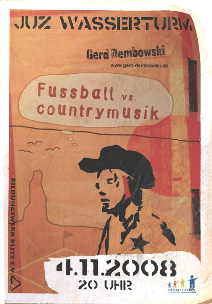 Das Plakat ist eine über den Kopierer gezogene Collage im Querformat. Im Hintergrund sehen wir eine schlafende Person in Punk-Outfit mit Iro in Nieten-Lederjacke inmitten einer Kulisse aus zahlreichen leeren Bier-, Sekt- und Schnapsflaschen. Davor sind die ausgeschnittenen Schriftzüge der Punkbands, die auf dem beworbenen Konzert in Eisenberg spielen, montiert: "Neue Katastrophen", "Rattenpisse" und "Frisur in Dur". Ort und Zeit (Wasserturm, 20.9.2008) sind am unteren Bildrand mit ausgeschnittenen Buchstaben aus verschiedenen Zeitschriften dargestellt, daneben zwei Sterni-Flaschen. Weitere Bildelemente ergänzen das in sich stimmige Gesamtbild: ein Totenkopf blickt von links unten auf sie Szenerie, ein Piktogramm zeigt einen Punk zeigt, der einen Molli wirft, zwei Schlagzeilen bringen zentrale Inhalte der Punk-Kultur auf den Punkt, Saufen ("Unsere Arme Leber: Sie hat nie Feierabend") und Arbeitskritik (ironisch: "Länger arbeiten: 72 Prozent sagen Ja"). Am oberen Bildrand verläuft in voller Breite der Schriftzug "Angemessene Kleidung ist erwünscht", montiert auf drei weißen Papier-Rechtecken.