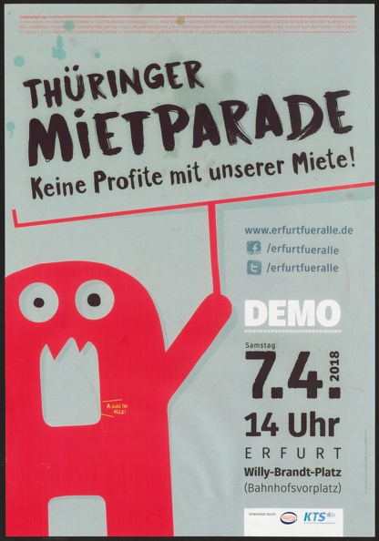 Das selbstgezeichnete Plakat ruft zu mehreren Aktionen am 13.10.2017 auf dem Inselplatz in Jena auf. Diese Aktionen stehen am unteren Rand des Plakats: "Umzug, Sokü, Freemarket, deine Ideen". Zusätzlich soll es auch eine Demo geben, was am oberen Rand des Plakts geschrieben steht. Auf dem Plakat ist der Jenaer Inselplatz gemalt, mit dem alternativen Wohnprojekt Insel, welches sich zu der damaligen Zeit auf dem Platz befand. Aus diesem Haus geht eine Sprechblase hervor mit "Jena braucht mehr INSELN". Im letzten Wort sind die Buchstaben N mit einem Pfeil geschrieben, ein Symbol vom Hausbesetzer*innen. Im Hintergrund sind noch einige Häuser zusehen u.a. der Jentower. Außerdem kommt von rechts ein Bagger auf den Inselplatz gefahren. Das zeigt auch den Hintergrund des Protests, denn der das Wohnhaus sollte abgerissen werden und der Inselplatz zu einem Uni-Campus werden.