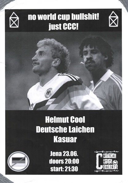 Das im Plakat ist in rot und schwarz auf weißem Hintergrund (A4, Querformat) gedruckt. In der linken Hälfte ist ein Mensch mit Akkordeon in einer Auftritts-Szene vor einem Mikrofon gemalt. In der rechten Hälfte ist das auffälligste Element der Name des Künstlers (Konny), darüber das Datum, darunter "Kleinkunstpunk", "Hackebeil Erfurt" und "21:00 Uhr".