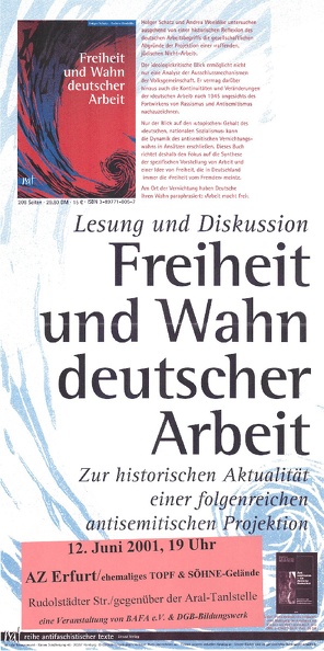 Das über den Kopierer auf gelbes A4-Papier vervielfältigte Plakat zeigt den von Außen aufgenommenen Zaun eines Lagers. Der Hinweis auf einen "Infotag an der Bauhaus-Universität Weimar" ist oben relativ groß, der Termin (26 und 27.1.2001) etwas kleine rund der Verweis auf zehn Veranstaltungen -- Lesungen, Filme, "Volxküche", eine öffentliche Gedenkveranstaltung mit Zeitzeugen und mehrere Konzerte -- in recht kleiner Schrift. Das Thema ist, ebenfalls in klein, am oberen Bildrand angegeben: "68 Jahre nach der Machtübergabe n Hitler, 56 Jahre nach der Befreiung des KZ Auschwitz".