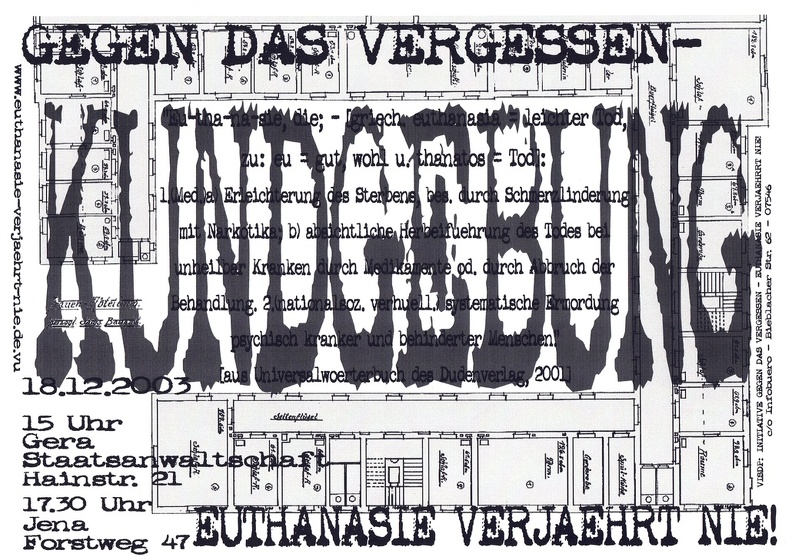 Die Raumaufteilung des in Querformat schwarz-weiß kopierte Plakat ist in etwa geviertelt: Rechts oben und links unten sehen wir (auch aus dem Kontext erschlossen) Familienfotos eines Gestapo-Offiziers: oben sitzend auf einer Bank mit drei Kindern, unten stehen mit zwei Kindern an der Hand. Rechts oben sind der Titel der beworbenen Veranstaltung gesetzt: "Mein Vater der Mörder", darunter kleiner "Film und Gespräch mit Beate Niemann" sowie Zeit und Ort (Besetztes Haus Erfurt). Im rechten unteren Teil erklärt ein Fließtext die Veranstaltung näher: "Nach der Wende besorgt sich Beate Niemann die Gauck-Akten ihres Vaters, um den von ihrer Familie als 'armer, unschuldiger Vater' bezeichneten, zu rehabilitieren. Seit 1947 daß ihr Vater im DDR-Gefängnis. Dabei erfährt sie die Wahrheit: Bruno Sattler war Massenmörder bei der Gestapo. Seitdem befindet sich Beate Niemann auf Spurensuche und wurde dabei von Yoash Tatari begleitet."