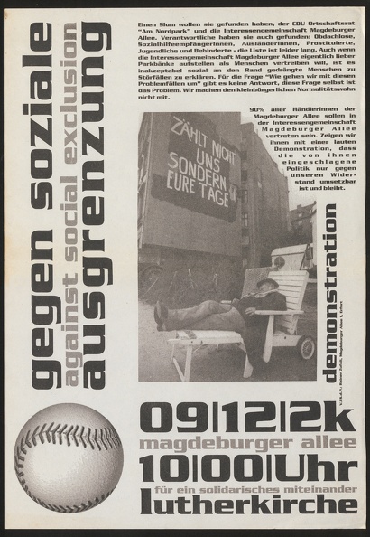 Das Plakat zeigt im Querformat vor gelbem Hintergrund rote Schemen die spiralförmig von der Mitte nach Außen weisen. Davor sind 17 unterschiedliche große schwarze Kreise gesetzt, in denen je eine oder mehrere Veranstaltungen in serifenloser Schrift beworben werden. Die Schriftgröße ist so gewählt, dass die Veranstaltungen jeweils mehrzeilig beschrieben werden, aber nur aus der Nähe lesbar sind. Unter den Kreisen ist in größerer Schrift Titel und Anlass des Plakats zu lesen: "(zwei) Drogenwoche(n)", etwas kleiner darunter "vom 17.11. bis 03.12.2000 in Weimar". Die Schrift mutet an, wie von einem Kind gemalt, u.A. ist das "N" seitenverkehrt dargestellt. Dass die Buchstaben aber jeweils gleich aussehen, macht klar, dass hier ein computergeneriertes Layout mit einer entsprechenden Schriftart vorliegt.