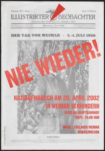 Hintergrund des hochkant schwarz-weiß kopierten Plakats ist eine mit einem Fischauge aufgenommene Fotografie der Gerberstraße in Weimar. Davor ist oben weißer, unten schwarzer Text in einer abgerundeten Schrift mit Serifen gesetzt. In voller Breite fällt zuerst die Wendung "Gerber bleibt!" im oberen Bildviertel ins Auge, darüber in kleiner "Dezernenten abreißen" und "Demo Samstag, 28. April", darunter "Für die selbstbestimmten Häuser Gerberstraße 1+3, Beginn 14 Uhr Hauptbahnhof". In der unteren Bildhälfte ist relativ viel Text gesetzt, der ein "Aktionswochenende 'Die Gerber geht an die Börse'" mit Konzert, Film, Straßenfest, etc. bewirbt, darunter wird die Demo "Gemeinsam solidarisch leben und Kämpfen" in Erfurt beworben.