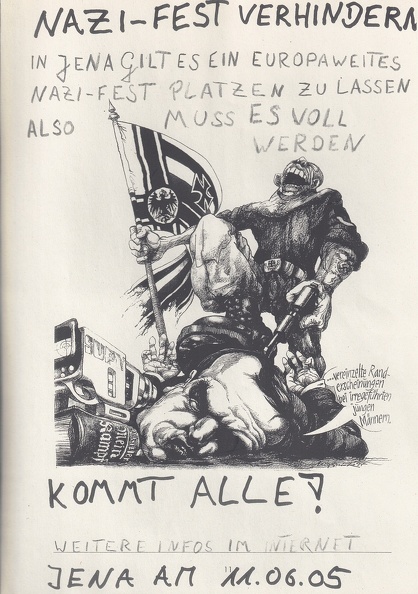 Dieses vor allem schwarze Plakat bewirbt im Stil einer Werbung für ein Open Air Konzert, unter dem Titel "Smash-the-Nazis 2004 Open Air", zu Gegenprotesten zu einem Naziaufmarsch vom "Nationalen und Sozialen Aktionsbündnis Westthüringen" , einer Gliederung des Thüringer Heimatschutzes, am 24.04.2004 in Meiningen. Am Vorabend, also am 23.04.2004, gab es in dem damaligen Infoladen Mittleres Tor in Meiningen eine als "Auftaktparty" benannte Infoveranstaltung zu dem kommenden Tag. Außerdem gab es am 24.04.2004 am selben Ort ab 8:00 Uhr "Soundcheck mit Frühstück". Diese Informationen sind in der oben Hälfte auf der rechten Seite des Plakats zu finden in weißer Schrift, unter der Überschrift "Demoguide" in orangener Schrift. Daneben befindet sich ein Bild von der Kika Figur Bernd das Brot, die grimmig schaut, vermummt ist, in der linken Hand ein Antifalogo und in der rechten Hand einen schwarzen Stern hat.