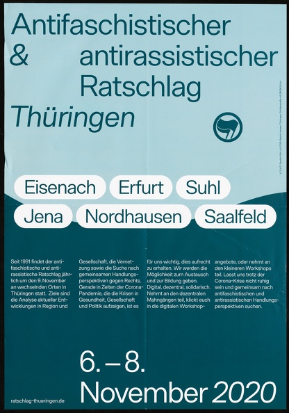 Das bundesweite Bündnis Irgendwo in Deutschland mobilisiert mit dem Plakat am 16.03.2019 nach Eisenach zu einer antifaschistischen Demonstration unter dem Motto "Die Wartburgstadt ins wanken bringen", welches in weißen Großbuchstaben in der Mitte des roten Plakats steht. Am oberen Rand befindet sich die Website des Bündnisses irgendwoindeutschland.org und der Verweis auf ihren Twitter-Kanal. Darunter befindet sich in einem weiß umrandeten Block der Spruch "Antifa in die Offensive" mit einem Antifa-Logo. Außerdem sind auf dem Plakat drei Bilder, die für Eisenach stehen sollen, der Wartburg, ein Auto, welches in Eisenach zu DDR-Zeiten produziert wurde, eine Luther Statue und das Burschenschaftsdenkmal, zudem es regelmäßig einen Fackelumzug von Burschenschaftlern gibt.