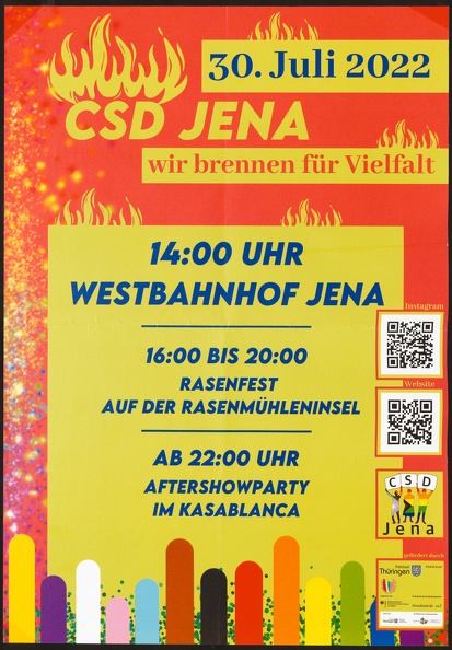 Vor einem weiß-blauen Farbberlauf ist ein gelb- und lilafarbenes Oval gesetzt, darin als Blickfang eine Faust mit einem Mikrofon. Darum ist in Lila Text gesetzt, der zu einem feministischen Hip-Hop-Festival im Kulturschlachthof Jena einlädt.
