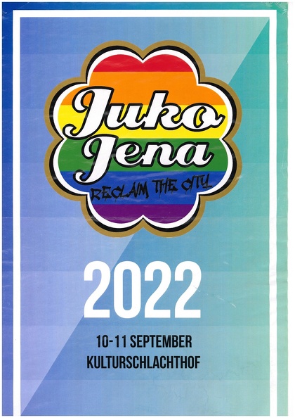Das hochkant gedruckte Plakat zeigt vor schwarzem Hintergrund als Bildelement in der oberen Hälfte des Plakats das Foto einer Antifademo. Über das Plakat sind lilafarbene Farbflächen verteilt, die teilweise leer sind, teilweise beschriftet sind und den Kontext klar machen: Beworben wird eine antirassistische und antifaschistische Demo im September 2022 in Gera. Am unteren Bildrand ist ein weißer Kasten mit zahlreichen Logos, u.A. von Denkbunt. Rechts und mittig ist eine selbst gestaltete Variante des Antifa-Logos zu sehen, die Fahnen sind eckiger als im Original, außerdem ist die schwarze Fahne mit AAG (Antifaschistische Aktion Gera) beschriftet.