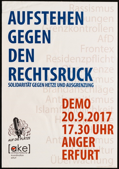 Die Aufmachung des Plakats erinnert an das Bühnenbild eines Puppentheaters. Zu sehen sind zwei Figuren, ein Affe und ein rosa Hase, die ein Transparent mit dem Slogan »Menschenrechte statt rechte Menschen« vor sich halten. Am oberen Bildrand steht auf Holzbalken der Schriftzug »Der AfD die Show stehlen!« Das Plakat macht auf den 12. September sowie ein Info- und Mobitreffen im Vorfeld der Aktion gegen die AfD aufmerksam. Unmittelbar vor der Bundestagswahl im September 2017 nutzte die AfD einen Demo-Auftritt in Jena unter dem Motto »Wir rocken Deutschland« mit Redner:innen wie Alice Weidel (als Spitzenkandidatin), Stephan Brandner (Thüringer Spitzenkandidat und MdL) und Denny Jankowski (Jenaer Direktkandidat), um sich in den letzten Wahlkampftagen erneut eine Bühne zu verschaffen. Am Demozug der AfD nahmen ca. 250 Personen teil, an den Gegenprotesten und -aktionen etwa 1.000 Menschen.