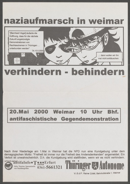 Das quer kopierte Plakat zeigt im Hintergrund unten die Skyline einer großen Stadt, oben die Blues-Brothers aus dem gleichnamigen Fillm. Davor ist in weißer, fetter, serifenloser Schrift der Anlass des Plakat gesetzt, oben "Tausend Sitzkissen gegen Nazis", unterhalb der Mitte "Rechtsradikale Horden dürfen nicht das Recht haben, unser Innenstadt-Straßenfest zu stören" und der Aufruf zu Sitzblockaden am 1. Mai 2000.