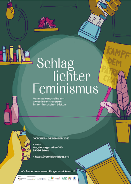 Vier gezeichnete Figuren (vermutlich gemeint: ein Autonomer, ein breiter Skinhead, ein überbreiter Punk und eine Frau, die ganz deutlich kleinste und dünnste Figur, auch die einzig tailierte) stehen böse blickend vor einem schwarzen Hintergrund, durchbrochen durch orange Linien. Die Frau hält eine schwarze Fahne mit einem durchgestrichenen Hakenkreuz. Zentral gesetzt davor der Text "Nicht in meiner Hood! Nazis raus aus Ilversgehofen", darunter die Werbung für eine Veranstaltung mit Katharina König-Preuß, AJZ, Ezra, Mobit und Betroffenen aus dem Stadtteil. Anlass der Veranstaltung waren die seit Sommer 2022 zunehmenden Naziübergriffe in Ilversgehofen.
