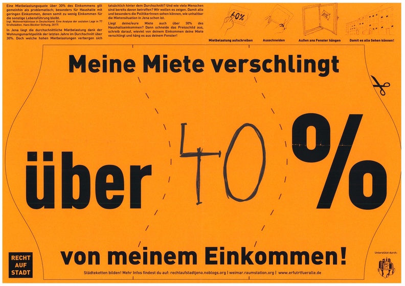 Das Bild zeigt vor helltürkisem Hintergrund das knallrote Logo der mietpolitischen Gruppe "Erfurt für Alle", ein anthropomorphes A, dass den Mund und die Augen aufreißt und ein Schild in der Hand hält. Das angedeutete Schild enthält dann den Titel der hier beworbenen Demo "Thüringer Mietparade" und kleiner den Slogan "Keine Profite mit unserer Miete". Am rechten Rand die Kontaktmöglichkeiten und die genauen Zeit- und Ortsangaben für die Demo.